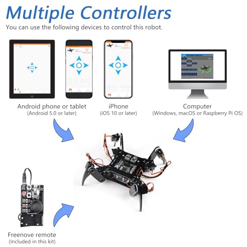 La connettività è garantita da un modulo WiFi ESP8266, che permette di controllare il robot da remoto. È possibile utilizzare un computer (Windows, macOS o Raspberry Pi OS), uno smartphone o tablet Android, o un iPhone. Freenove mette a disposizione anche un'app dedicata per un controllo più intuitivo. Per gli utenti più esperti, la piattaforma open-source offre infinite possibilità di personalizzazione: è possibile modificare il codice esistente o scriverne di nuovo da zero per implementare nuovi movimenti, comportamenti e interazioni. La scheda di controllo dispone anche di porte aggiuntive per collegare sensori e moduli esterni, aprendo la porta a espansioni future.