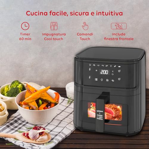 Entrambi i modelli condividono un'estetica moderna e funzionale, con un corpo macchina robusto e un ampio display digitale touchscreen che rende l'utilizzo estremamente intuitivo. L'interfaccia permette di selezionare facilmente uno dei programmi preimpostati, oppure di regolare manualmente temperatura e timer per un controllo completo sulla cottura. Il modello da 12 litri, in particolare, si distingue per la sua struttura "a fornetto", con uno sportello frontale trasparente che permette di monitorare la cottura senza dover estrarre il cestello, un vantaggio non da poco rispetto al classico design a cassetto del modello da 8 litri.