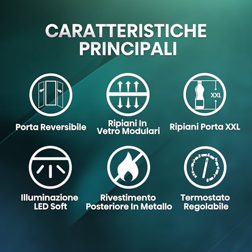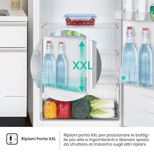 All'interno, l'organizzazione è pensata per essere funzionale. I ripiani in vetro temperato sono robusti e possono essere regolati in altezza o rimossi per fare spazio a contenitori più ingombranti, come torte o pentole. Un punto di forza menzionato spesso è la presenza di balconcini porta XXL, abbastanza ampi da ospitare bottiglie di grandi dimensioni o addirittura due file di lattine, liberando spazio prezioso sui ripiani principali. L'illuminazione interna è affidata a luci LED, che garantiscono un'ottima visibilità in ogni angolo del frigo, consumando meno energia e producendo meno calore rispetto alle tradizionali lampadine.