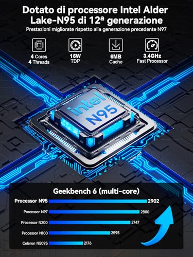 Il vero protagonista di questo mini PC è il processore Intel Core i5-12450H. Si tratta di una CPU per notebook di fascia alta, basata sull'architettura Alder Lake, annunciata a inizio 2022. Con i suoi 8 core e 12 thread e una frequenza che può raggiungere i 4.4 GHz in Turbo, questo processore offre prestazioni davvero notevoli per un dispositivo di queste dimensioni. Nell'uso quotidiano, questo si traduce in un'esperienza fluida e reattiva, anche con molte applicazioni aperte contemporaneamente.