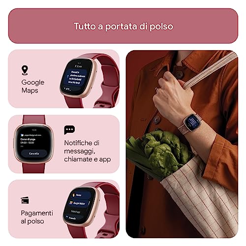 Con l'acquisizione di Fitbit da parte di Google, le aspettative erano alte. Il Versa 4 integra alcune funzioni utili dell'ecosistema di Mountain View, come Google Maps per le indicazioni stradali e Google Wallet per i pagamenti contactless, che si affianca al già presente Fitbit Pay. Puoi anche rispondere alle chiamate direttamente dal polso grazie a microfono e altoparlante integrati e ricevere le notifiche dallo smartphone.