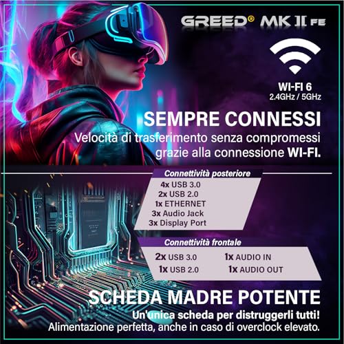 Un buon PC da gaming deve essere anche versatile. Il Greed MK2 offre una connettività completa: numerose porte USB 3.0 e 2.0, uscite video HDMI e DisplayPort per configurazioni multi-monitor, porta Ethernet e, nella maggior parte dei casi, connettività Wi-Fi integrata. Tuttavia, alcuni utenti hanno segnalato che per il gaming online competitivo è sempre preferibile una connessione cablata per la massima stabilità. Un punto da considerare è la possibile assenza di porte USB-C su alcuni modelli. In termini di espandibilità futura, il case di formato Midi Tower offre spazio per aggiungere altri dischi o, in futuro, sostituire la scheda grafica senza problemi.