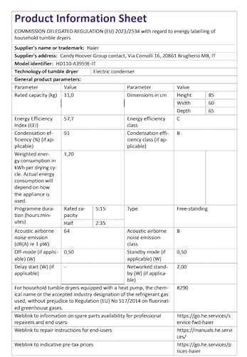 In conclusione, l'asciugatrice Haier I-Pro Serie 5 HD110-A3959E-IT è un elettrodomestico che eccelle per capacità di carico, innovazione tecnologica e funzioni smart. La possibilità di asciugare fino a 11 Kg di bucato, unita alla praticità del programma a vapore I-Refresh e alla gestione da remoto tramite l'app hOn, la rendono un prodotto estremamente versatile e moderno, adatto a soddisfare le esigenze delle famiglie più esigenti. La cura per i dettagli, come la luce interna e la certificazione Woolmark, ne aumentano ulteriormente il valore. L'unico vero neo è rappresentato dalla classe energetica C, un compromesso da valutare attentamente. Se cercate massima capienza e funzioni all'avanguardia e siete disposti a un piccolo compromesso sui consumi, questa asciugatrice rappresenta una scelta solida e performante.