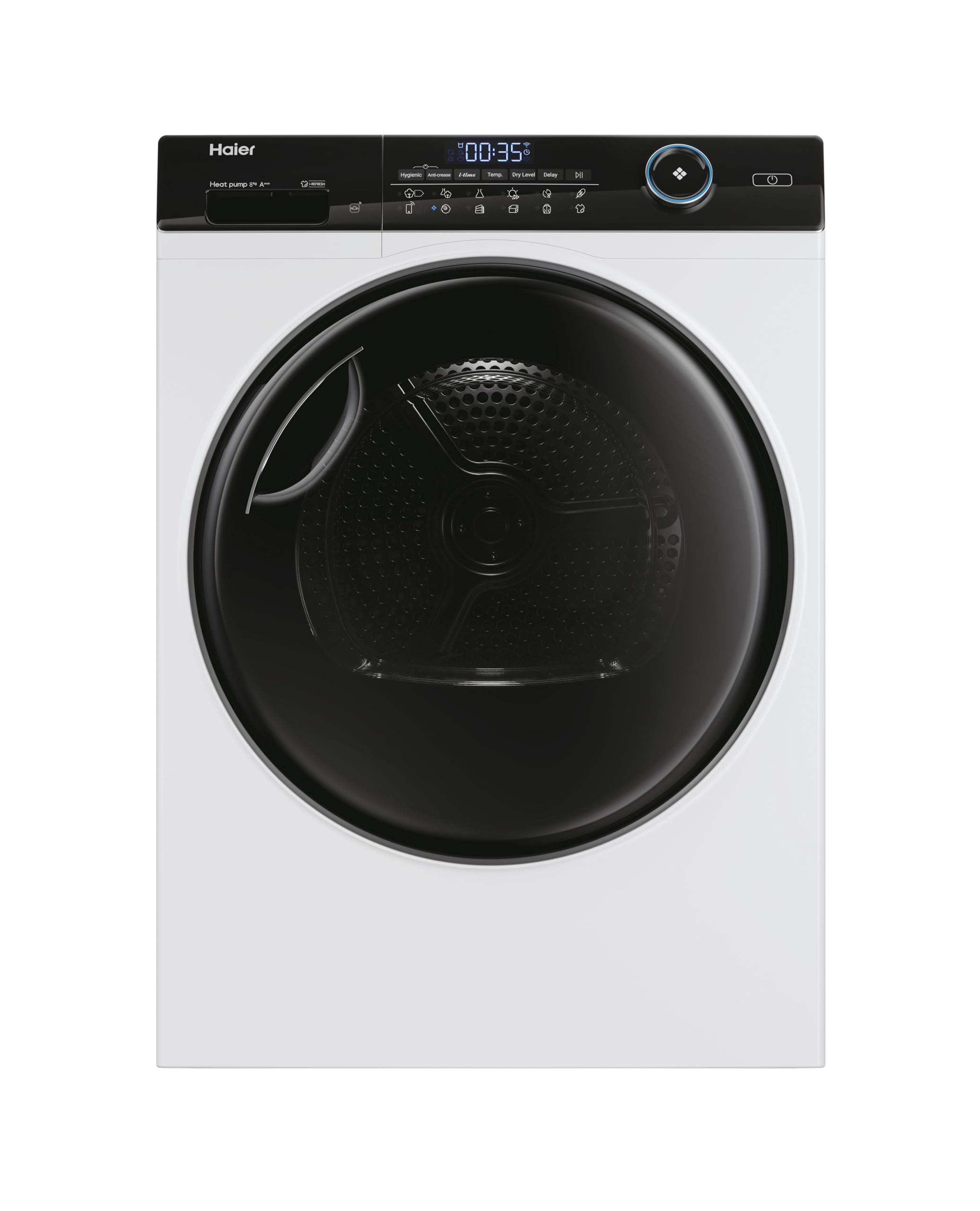 L'asciugatrice Haier I-Pro Serie 5 si presenta con un design moderno e pulito, di colore bianco con un oblò nero a contrasto che le conferisce un tocco di eleganza. Le sue dimensioni standard (84,5x59,5x67,5 cm) la rendono adatta alla maggior parte degli spazi domestici. Una delle prime cose che saltano all'occhio è la cura dei dettagli, come la possibilità di invertire il senso di apertura della porta, una vera comodità per adattarla a qualsiasi layout della lavanderia.
