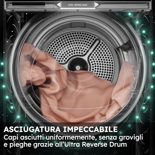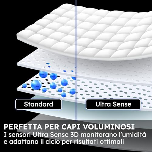 La tecnologia Ultra Sense 3D Tech, invece, agisce come un vero e proprio sensore intelligente. Grazie a un sistema di rilevamento dell'umidità tridimensionale, l'asciugatrice è in grado di capire esattamente quando i capi sono perfettamente asciutti, interrompendo il ciclo al momento giusto. Questo evita il rischio di "sovra-asciugatura", un fenomeno che a lungo andare può danneggiare le fibre e restringere i vestiti. In pratica, l'asciugatrice si adatta al carico, garantendo un trattamento personalizzato per ogni tipo di bucato, dai piumini multistrato ai capi più leggeri.