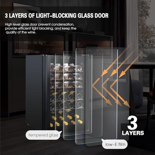 Il controllo delle impostazioni è affidato a un pannello touchscreen intuitivo e facile da usare, che permette di regolare la temperatura con precisione. Un elemento tecnico molto importante è la porta in vetro a 3 strati con una speciale pellicola a basso emissivo (Low-E). Questa caratteristica non è solo un dettaglio estetico: serve a isolare termicamente l'interno, proteggendo le bottiglie dagli sbalzi di temperatura esterna e dai dannosi raggi UV, che possono alterare le proprietà organolettiche del vino. Inoltre, previene la formazione di condensa, mantenendo l'interno asciutto e pulito.