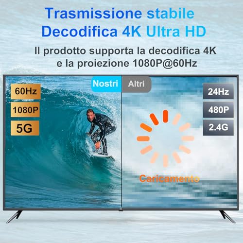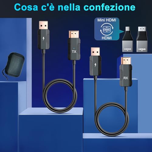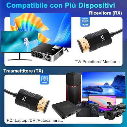 L'installazione è un vero e proprio plug-and-play. Basta collegare il trasmettitore (TX) alla porta HDMI della sorgente (ad esempio un PC, un lettore Blu-ray o una console) e il ricevitore (RX) alla porta HDMI del display (TV, monitor o proiettore). Una volta alimentate entrambe le unità tramite USB, queste si accoppiano automaticamente in pochi secondi, senza bisogno di installare software, driver o app. Nella maggior parte dei casi, l'esperienza è immediata e senza intoppi, rendendo il prodotto accessibile anche a chi non ha particolari competenze tecniche.