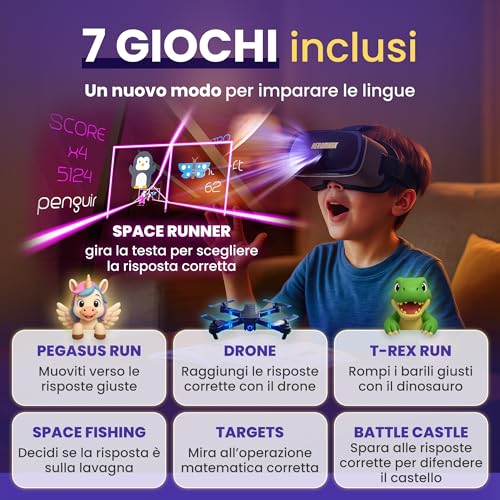 Una volta indossato il visore, ci si ritrova catapultati in un'ambientazione spaziale. I giochi sono strutturati in modo intuitivo: una voce guida propone delle sfide (ad esempio, "colpisci il risultato di 5x8" o "trova la 'mela' in inglese") e il bambino deve guardare l'oggetto corretto e premere il pulsante per "sparare" e confermare la risposta. Questo approccio, che sostituisce la violenza tipica di molti videogiochi con l'istruzione, si è dimostrato molto coinvolgente e motivante per i piccoli tester. L'apprendimento diventa un'azione attiva e gratificante.