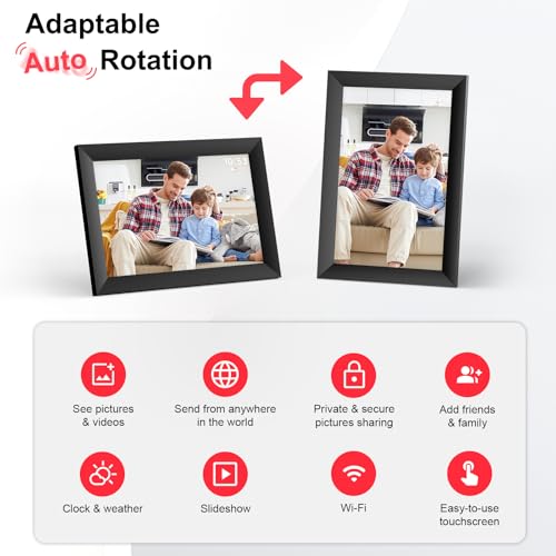 L'interfaccia della cornice è touch screen, reattiva e intuitiva. Permette di navigare tra le foto, metterle in pausa, eliminarle o nasconderle, e accedere facilmente a tutte le impostazioni, come la modalità slideshow, la luminosità e la modalità di sospensione.