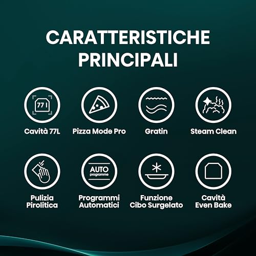 - Capacità interna XXL da 77 litri, ideale per grandi portate e cottura multilivello.