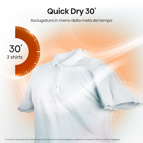 - Quick 30': perfetto per quando si ha fretta, permette di asciugare un piccolo carico in soli 30 minuti, risparmiando tempo ed energia.