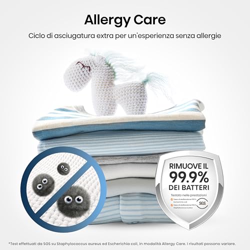 - Allergy Care: un programma che utilizza aria calda ad alta temperatura per rimuovere fino al 99,99% di batteri come Escherichia coli e Staphylococcus aureus, ideale per chi ha pelli sensibili o allergie.