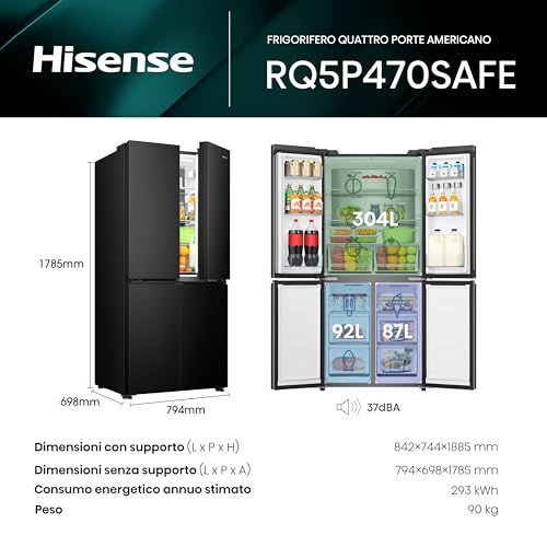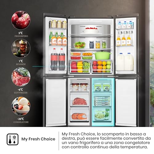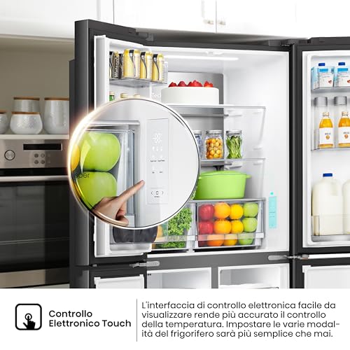 Appena lo si vede, l'Hisense Frigorifero Quattro Porte (spesso identificato con modelli come l'RQ760N4AIF) colpisce per le sue dimensioni generose e per il suo design elegante. La finitura in acciaio inox (o nero spazzolato, a seconda del modello) gli conferisce un aspetto premium che si adatta perfettamente alle cucine moderne, specialmente quelle con un'estetica industriale. Le quattro porte non sono solo un vezzo stilistico, ma un vero e proprio punto di forza in termini di praticità: permettono un accesso più semplice e organizzato ai vari scomparti, riducendo la dispersione di freddo quando si apre solo una sezione.