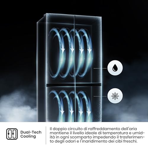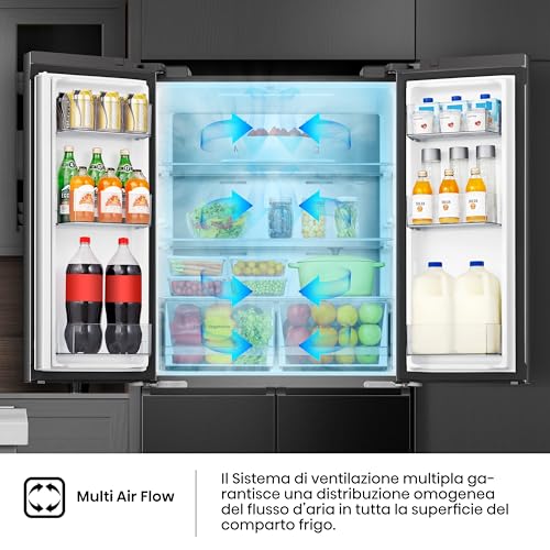 Hisense non ha lesinato sulla tecnologia. Uno degli aspetti più interessanti è il sistema Dual Tech Cooling, che mantiene livelli di umidità ideali e separati tra frigorifero e congelatore. Questo significa niente più mescolanza di odori e cibi che si seccano. A questo si aggiunge il Multi Air Flow System, che garantisce una distribuzione uniforme dell'aria fredda in ogni angolo, mantenendo una temperatura costante e preservando la freschezza degli alimenti più a lungo.