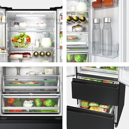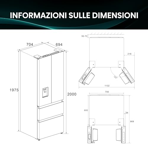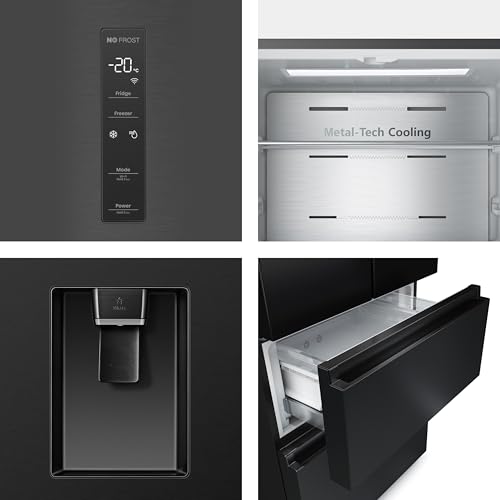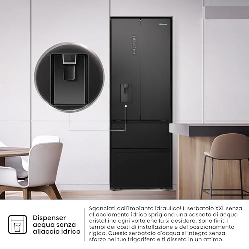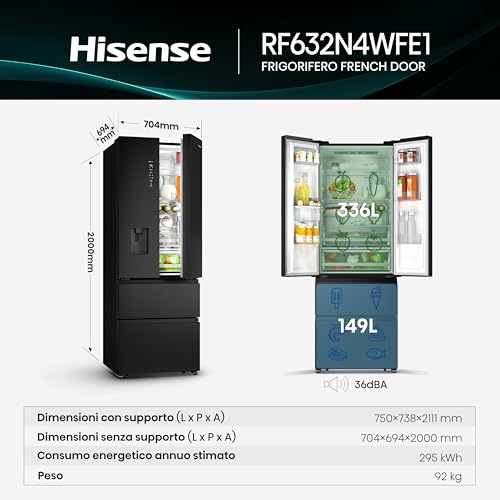 A prima vista, l'Hisense RF632N4WFE1 colpisce subito per il suo design. La finitura nera (disponibile anche in versione Inox con il codice RF632N4BCE) e la struttura French Door a quattro porte gli conferiscono un aspetto decisamente premium ed elegante, capace di integrarsi bene in cucine moderne. Nonostante l'imponenza data dai suoi 2 metri di altezza, la larghezza di soli 70 cm e la profondità contenuta a meno di 70 cm lo rendono una soluzione interessante per chi desidera una grande capacità senza avere lo spazio per un classico "bestione" americano.
