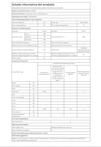 Con i suoi 485 litri totali di capacità, suddivisi in 336 per il frigo e 149 per il freezer, questo Hisense è pensato per le esigenze di famiglie numerose, fino a cinque persone. All'interno del vano frigo troviamo due ampi ripiani in vetro temperato, diversi balconcini controporta e due cassetti dedicati. Uno di questi, chiamato Moisture Fresh Crisper, permette di regolare l'umidità per conservare al meglio frutta e verdura. È presente anche una comoda rastrelliera portabottiglie in metallo, un tocco di classe che libera spazio prezioso sui balconcini.