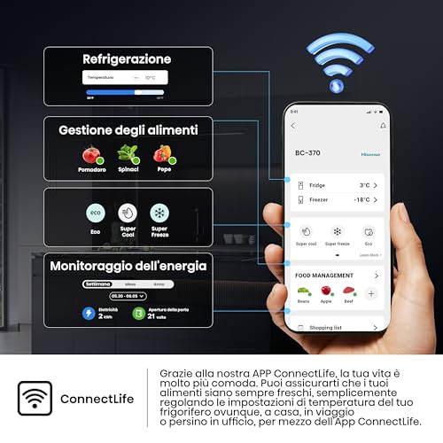 In un'epoca sempre più connessa, anche gli elettrodomestici si evolvono. L'Hisense RL3K3K370SEIE è dotato di connettività WiFi che, tramite l'app ConnectLife, permette di monitorare e controllare il frigorifero da remoto. Si può regolare la temperatura, ricevere notifiche in caso di porta lasciata aperta o di malfunzionamenti, tutto comodamente dal proprio smartphone. Una funzionalità che aggiunge un livello di comodità e controllo non indifferente.
