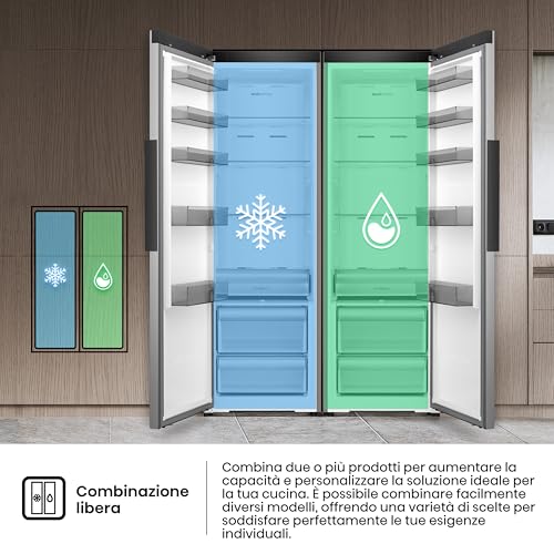 Appena estratto dall'imballaggio, l'Hisense RL3K3K370SEIE colpisce per il suo design pulito e moderno. La finitura in acciaio inox spazzolato non solo conferisce un aspetto premium, ma si integra con facilità in qualsiasi stile di cucina, da quella più classica a quella contemporanea. Le sue dimensioni (185.6 x 59.5 cm) sono studiate per un inserimento "Kitchen Fit", ovvero per allinearsi perfettamente con i mobili della cucina, creando una continuità visiva piacevole e ordinata. La profondità di circa 60 cm è un ulteriore punto a favore in questo senso. Le maniglie verticali sono ergonomiche e la porta è reversibile, una caratteristica sempre apprezzata per una maggiore flessibilità di installazione.