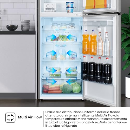 A contribuire a questo risultato c'è anche il sistema Multi Air Flow, che distribuisce l'aria fredda in modo omogeneo in tutto il vano frigo. In questo modo, ogni alimento riceve il giusto grado di refrigerazione, indipendentemente dalla sua posizione sui ripiani. Il compressore Inverter, inoltre, regola la potenza in base alle reali necessità, garantendo un funzionamento più silenzioso, un risparmio energetico e una maggiore durata nel tempo.