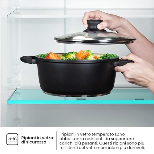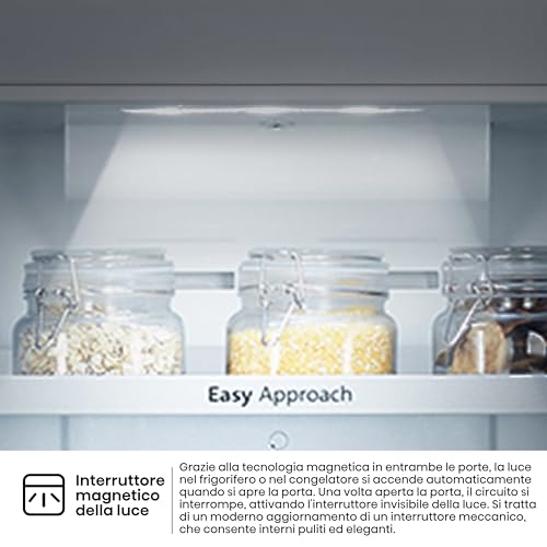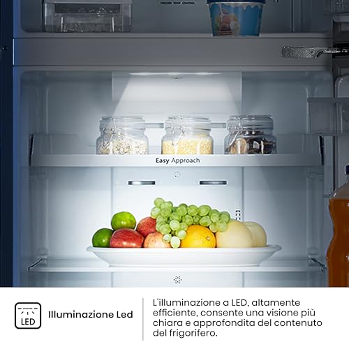 L'interno è ben organizzato: il vano frigo dispone di 4 ripiani in vetro temperato, resistenti e facili da pulire, e un ampio cassetto per frutta e verdura. La controporta è dotata di tre balconcini per bottiglie e altri contenitori. Il congelatore, posto nella parte superiore, è anch'esso ben strutturato per massimizzare lo spazio disponibile. Un dettaglio apprezzato è l'illuminazione interna a LED, che garantisce una visibilità ottimale in ogni angolo del frigorifero, consumando meno energia rispetto alle lampadine tradizionali.