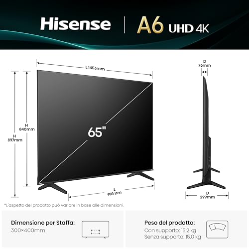 A un primo sguardo, l'Hisense 43E63QT si presenta con un design moderno e minimale. Le cornici su tre lati sono estremamente sottili, un dettaglio che favorisce l'immersione nei contenuti e che non è scontato trovare in questa categoria di prodotto. La cornice inferiore è leggermente più spessa e ospita il logo del brand. I materiali sono prevalentemente plastici, ma l'assemblaggio generale restituisce una sensazione di solidità. I due piedini a "V" garantiscono una buona stabilità al televisore, anche se, come per molti modelli in questa fascia, è consigliabile evitare sollecitazioni eccessive.