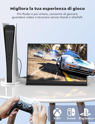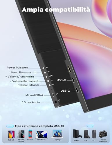 La vera magia sta nella funzionalità plug and play. Se il vostro laptop o smartphone è dotato di una porta USB-C che supporta la trasmissione video (come Thunderbolt 3 o USB 3.1), vi basterà un singolo cavo USB-C per trasmettere sia il segnale video che l'alimentazione. Questo semplifica enormemente il setup, eliminando l'ingombro di cavi aggiuntivi. Per i dispositivi che non supportano l'uscita video tramite USB-C, la porta Mini-HDMI garantisce comunque una connessione facile e veloce con PC, console da gioco come PS4, PS5, Xbox, Nintendo Switch e molti altri dispositivi.