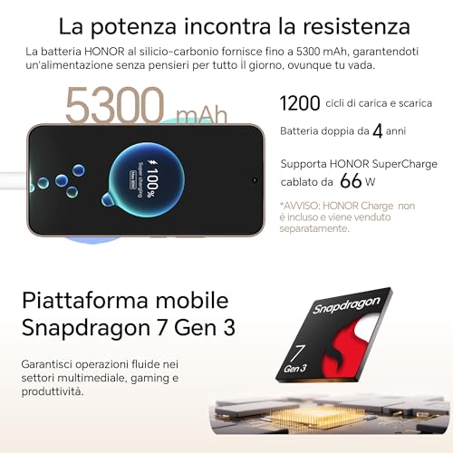Nonostante il design sottile e leggero, HONOR è riuscita a inserire una capiente batteria da 5300 mAh. Questo si traduce in un'autonomia eccellente: si arriva senza problemi a fine giornata anche con un utilizzo intenso, e con un uso più moderato si possono tranquillamente coprire due giorni. La ricarica rapida a 66W permette di riportare lo smartphone al 100% in tempi brevi, anche se è un leggero passo indietro rispetto alla generazione precedente. Manca, purtroppo, la ricarica wireless.