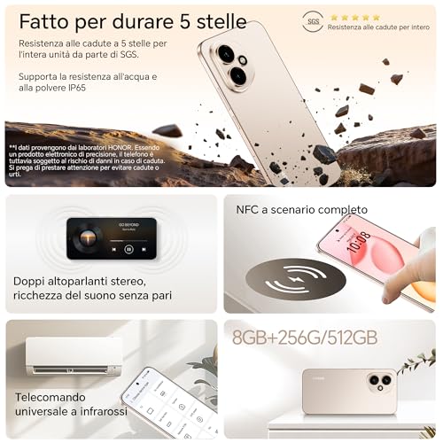 Nonostante la scocca sia realizzata interamente in plastica, la qualità costruttiva percepita è alta e non si ha l'impressione di avere tra le mani un dispositivo economico. Anzi, HONOR ha curato i dettagli, ottenendo anche la certificazione IP65 contro polvere e spruzzi d'acqua e una certificazione SGS a cinque stelle per la resistenza alle cadute. Questo significa che potrete usarlo con maggiore tranquillità nella vita di tutti i giorni, anche sotto la pioggia.