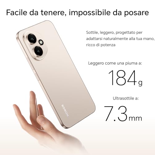 Appena si prende in mano l'HONOR 400, la prima sensazione è di una piacevole leggerezza e maneggevolezza. Con un peso di soli 184 grammi e uno spessore di appena 7,3 millimetri, si distingue nettamente da molti "mattoni" che affollano il mercato. Queste dimensioni contenute, unite a un design con bordi piatti, lo rendono comodo da impugnare e utilizzare anche con una sola mano per periodi prolungati.