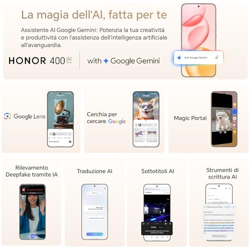 HONOR 400 arriva con Android 15 e l'interfaccia personalizzata MagicOS 9. La vera novità è l'integrazione profonda di funzionalità basate sull'Intelligenza Artificiale, solitamente riservate ai modelli flagship. Queste funzioni sono disseminate in tutto il sistema operativo e mirano a semplificare le attività quotidiane, rendendo l'esperienza utente più intuitiva e intelligente. Un altro punto a favore, e non da poco, è la promessa di ben 6 anni di aggiornamenti, incluse le nuove versioni di Android, una garanzia di longevità notevole.