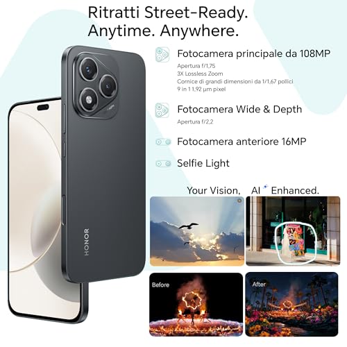 Il comparto fotografico dell'HONOR 400 Lite 5G è caratterizzato da una scelta precisa: puntare tutto sul sensore principale. Troviamo infatti una fotocamera posteriore da ben 108 MP con apertura f/1.75, affiancata da un sensore ultra-grandangolare da 5 MP che funge anche da sensore di profondità.