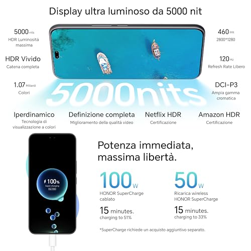 Un hardware così potente richiede un'adeguata riserva di energia. HONOR ha equipaggiato il 400 Pro con una generosa batteria da 5300 mAh. Questa capacità, unita all'efficienza del processore Snapdragon e alle ottimizzazioni software, dovrebbe garantire un'autonomia eccellente, in grado di coprire senza problemi un'intera giornata di utilizzo intenso e, con un uso più moderato, anche due giorni. Stando ai dati, la batteria può fornire fino a 33 ore di chiamate vocali o 15 ore di intrattenimento online. La ricarica è altrettanto impressionante, con supporto alla SuperCharge cablata da 100W e a quella wireless da 50W, per riportare lo smartphone al 100% in tempi rapidissimi.