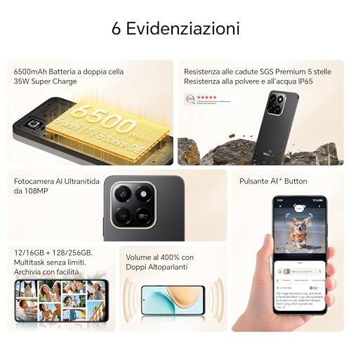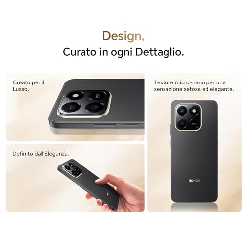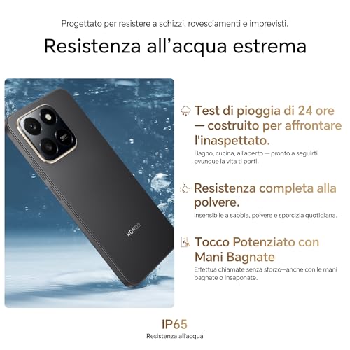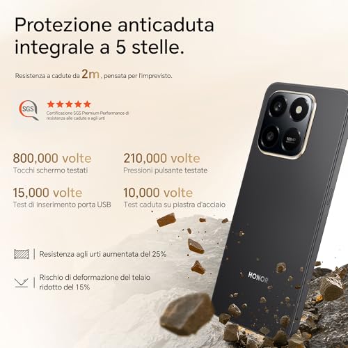 HONOR ha posto grande accento sulla durabilità. Lo smartphone ha ottenuto la certificazione SGS a 5 stelle per la protezione contro le cadute fino a 1,8 metri e la certificazione IP65, che ne attesta la resistenza a polvere e schizzi d'acqua. Questo lo rende un compagno affidabile anche in condizioni non ottimali, un vero e proprio "muletto" da battaglia. Sul frontale, le cornici non sono sottilissime, con un "mento" un po' pronunciato, caratteristiche tipiche degli smartphone di questa categoria.