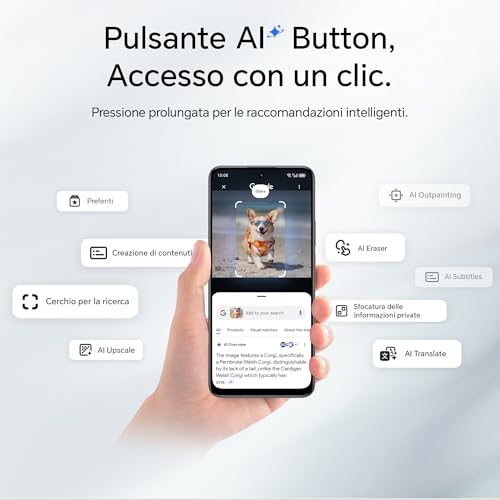La connettività include il supporto Dual SIM 4G, Wi-Fi dual-band, Bluetooth 5.0 e NFC per i pagamenti contactless. Una dotazione completa che copre tutte le necessità. È presente anche un pulsante fisico laterale dedicato all'intelligenza artificiale, che permette di accedere rapidamente a funzioni smart.