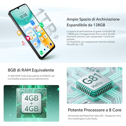 Sotto il cofano dell'HONOR X5c Plus troviamo un processore Octa-core, che secondo alcune fonti dovrebbe essere il MediaTek Helio G81, abbinato a 4 GB di RAM e tagli di memoria interna da 128 GB o 256 GB, fortunatamente espandibile tramite microSD. Questa configurazione hardware è pensata per garantire un'esperienza utente fluida nelle operazioni di tutti i giorni. Non è uno smartphone da gaming spinto, sia chiaro, ma per social media, messaggistica, navigazione web, video in streaming e giochi casual, si comporta egregiamente. La RAM da 4 GB è il minimo sindacale oggi, ma grazie alle ottimizzazioni software di HONOR, il multitasking basilare viene gestito senza troppi affanni.