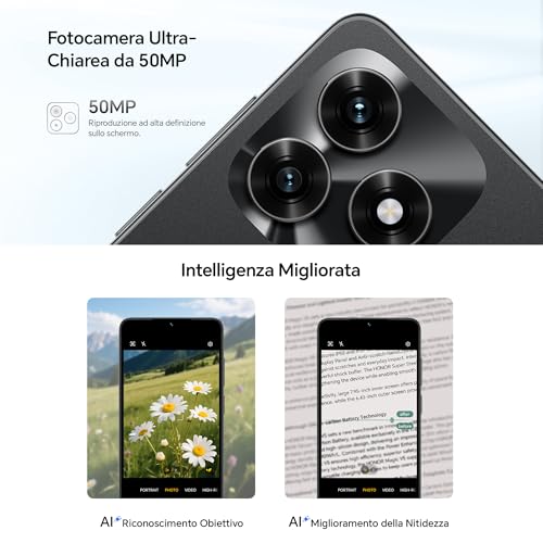 Il comparto fotografico è uno dei punti di forza dichiarati da HONOR. Sul retro troviamo una doppia fotocamera con un sensore principale da 50 MP. Questo sensore, in buone condizioni di luce, è in grado di catturare immagini dettagliate e con colori fedeli. L'intelligenza artificiale aiuta a ottimizzare gli scatti in diverse scene, rendendo il punta e scatta molto efficace. Quando la luce cala, la qualità inevitabilmente diminuisce e compare un po' di rumore digitale, ma i risultati restano accettabili per la fascia di prezzo. Il secondo sensore, indicato come da 14MP in alcune schede, è probabilmente un sensore di profondità o macro, utile per i ritratti con effetto bokeh. La fotocamera frontale, da 5 MP, è sufficiente per selfie senza troppe pretese e per le videochiamate.