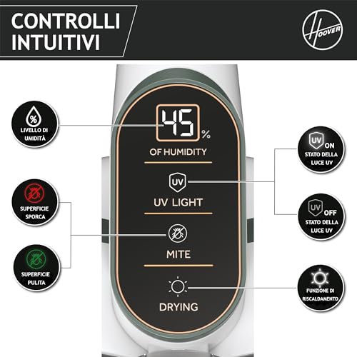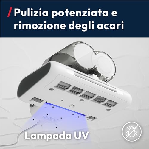 - Lampada UV-C igienizzante: qui entra in gioco la tecnologia. Una lampada UV-C si attiva a contatto con la superficie, contribuendo a ridurre batteri, allergeni e acari della polvere. Per la massima sicurezza, la luce si spegne automaticamente non appena il dispositivo viene sollevato.