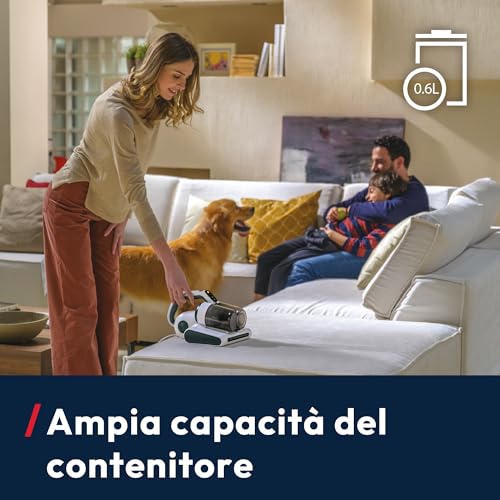 - Battitura (Beat&Roll): una speciale spazzola motorizzata, chiamata "agitatore", ruota a ben 4.200 giri al minuto. Le sue setole morbide in nylon e gomma "battono" delicatamente la superficie, smuovendo e sollevando polvere, acari e detriti intrappolati in profondità, senza rovinare i tessuti.