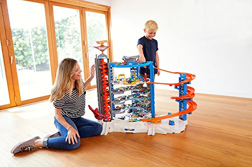 - Livello 2: La Gara Testa a Testa. Salendo con l'ascensore a due posti, si arriva al secondo livello, pensato per le sfide di velocità. I bambini possono posizionare due macchinine (due veicoli Hot Wheels sono inclusi nella confezione) e lanciarle in una gara fianco a fianco. Il meccanismo di lancio è semplice ed efficace, garantendo partenze eque e tanto divertimento.