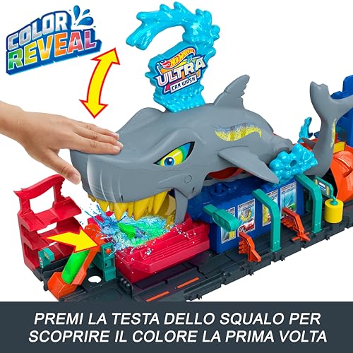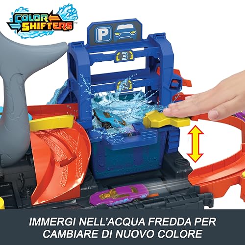 Il cuore del divertimento di questo playset risiede nella sua interattività e, soprattutto, nell'elemento "acqua". Il gioco inizia lanciando la macchinina Color Reveal inclusa sulla rampa, direttamente nella bocca dello squalo. Premendo la testa dello squalo, si attiva un meccanismo che fa cadere il veicolo in una vasca di acqua calda. Qui avviene la prima "magia": la vernice speciale si scioglie, rivelando la vera decorazione della macchinina. È un momento di grande stupore per i più piccoli.