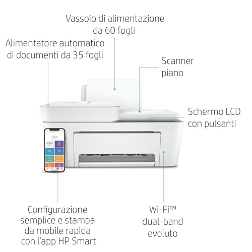 La HP DeskJet 4120e è pensata per un mondo senza fili. È dotata di Wi-Fi dual-band (2.4 e 5.0 GHz) che assicura una connessione più stabile e veloce. La configurazione tramite l'app HP Smart e il Bluetooth è semplice e intuitiva, permettendo di essere operativi in pochi minuti. È presente anche una porta USB 2.0 per chi preferisse la classica connessione via cavo.