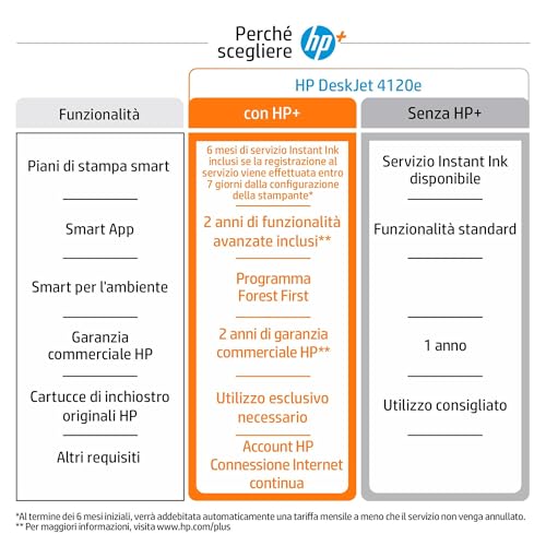 Strettamente legato a HP+ c'è il servizio Instant Ink. Spesso, con l'acquisto della stampante sono inclusi alcuni mesi di prova gratuita. Si tratta di un servizio in abbonamento: la stampante rileva quando l'inchiostro sta per finire e ordina automaticamente le nuove cartucce, che vengono recapitate a casa. I piani si basano sul numero di pagine stampate al mese, non sulla quantità di inchiostro consumato. Questo può essere molto conveniente per chi stampa molte foto o documenti a colori, ma meno per chi stampa solo testo in bianco e nero.