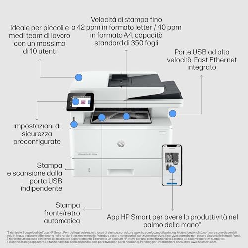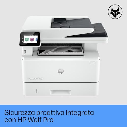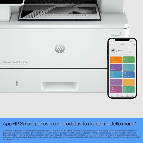 La HP Laserjet Pro MFP 4102dw è una stampante multifunzione laser monocromatica che eccelle dove conta di più per un ufficio: velocità, affidabilità e qualità di stampa. È un dispositivo robusto, pensato per sostenere carichi di lavoro intensi senza battere ciglio. Le funzionalità di scansione fronte/retro automatica tramite ADF, l'ampia connettività e gli strumenti di gestione avanzata la rendono una scelta eccellente per piccoli e medi team di lavoro che necessitano di un dispositivo performante e completo. Il blocco potenziale delle cartucce non originali è un aspetto da considerare, ma se la priorità è massimizzare la produttività con un dispositivo solido e veloce, la 4102dw è senza dubbio una delle migliori opzioni nella sua categoria.