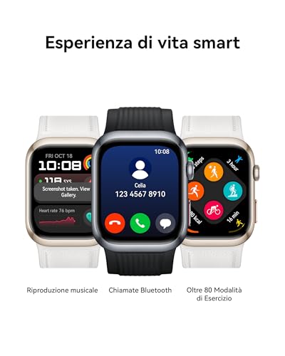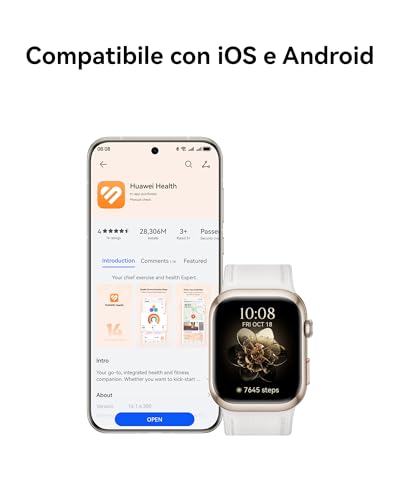 Lo smartwatch è compatibile sia con Android (8.0 e superiori) che con iOS (13.0 e superiori) tramite l'app HUAWEI Health, garantendo un'integrazione fluida con la maggior parte degli smartphone. L'esperienza utente è migliore su Android, dove è possibile utilizzare le risposte rapide ai messaggi, una funzione limitata su iPhone. Un piccolo neo è l'assistente vocale Celia, che funziona solo se abbinato a smartphone Huawei, una limitazione che ne riduce la versatilità.