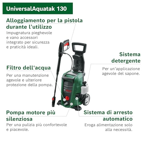 - Bosch UniversalAquatak 135: È il top di gamma della serie Universal. Con i suoi 1900 Watt, 135 bar di pressione e una portata di 410 l/h, è la scelta giusta per chi deve affrontare lo sporco più ostinato su grandi superfici, come vialetti, muretti e facciate.