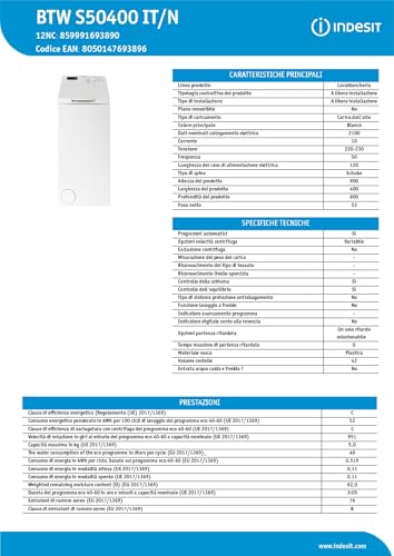 La Indesit BTW S50400 IT/N si posiziona in classe di efficienza energetica C (secondo la nuova etichettatura). Il consumo energetico ponderato è di 52 kWh per 100 cicli, mentre il consumo di acqua per il programma eco è di 40 litri per ciclo. Si tratta di valori discreti che, pur non essendo al top della categoria, garantiscono una gestione dei consumi tutto sommato contenuta, soprattutto grazie al sensore Water Balance Plus.