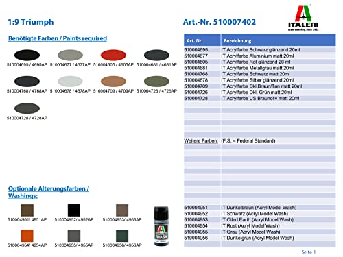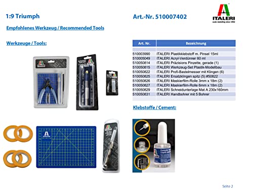 In conclusione, l'Italeri 7402 - Triumph 3wh Model Kit Scala 1:9 è un kit eccellente e altamente raccomandato. È un tuffo nel passato su due fronti: rievoca un'iconica motocicletta della Seconda Guerra Mondiale e riporta in vita uno stampo storico del modellismo. Nonostante la sua età, il kit si difende egregiamente, offrendo un livello di dettaglio e una qualità costruttiva che possono competere con produzioni più recenti. È il progetto perfetto per il modellista che non si spaventa di fronte a qualche piccola sfida e che vuole aggiungere alla propria collezione un pezzo di grande impatto visivo e dal profondo valore storico. Se cerchi un'esperienza di montaggio appagante e un modello finale che non passerà inosservato, hai trovato il kit che fa per te.