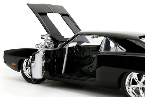 Ciò che colpisce immediatamente di questo modello Jada è l'impressionante livello di dettaglio. Dall'aggressiva griglia anteriore al cofano bombato con l'iconico compressore volumetrico (blower) che spunta fuori, ogni elemento distintivo della Charger di Dom è stato replicato con cura. Non si tratta di una scocca vuota: il modellino vanta diverse parti apribili che ne aumentano il realismo e l'interattività.