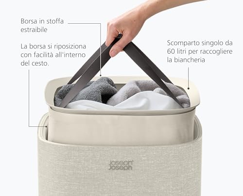 Il Tota si presenta con un design minimalista ed elegante, disponibile in diverse colorazioni neutre (come grigio, nero ed ecru) che si adattano facilmente a qualsiasi stile di arredamento. La sua struttura esterna è in tessuto di poliestere, che gli conferisce un aspetto più simile a un complemento d'arredo che a un semplice cesto per il bucato. Ma la vera magia, come spesso accade con i prodotti Joseph Joseph, si nasconde all'interno.