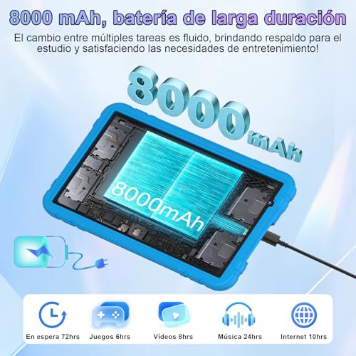 Nell'uso di tutti i giorni, il JUEDUR R500 si comporta bene. La navigazione tra le app è fluida, e i giochi educativi o di intrattenimento per bambini girano senza problemi. La generosa dotazione di RAM aiuta a mantenere le prestazioni stabili anche con diverse applicazioni aperte. La batteria da 8000mAh garantisce una buona autonomia, permettendo di coprire tranquillamente una giornata di utilizzo intenso tra giochi, video e attività educative. La ricarica avviene tramite la porta USB Type-C, uno standard ormai diffuso e comodo.